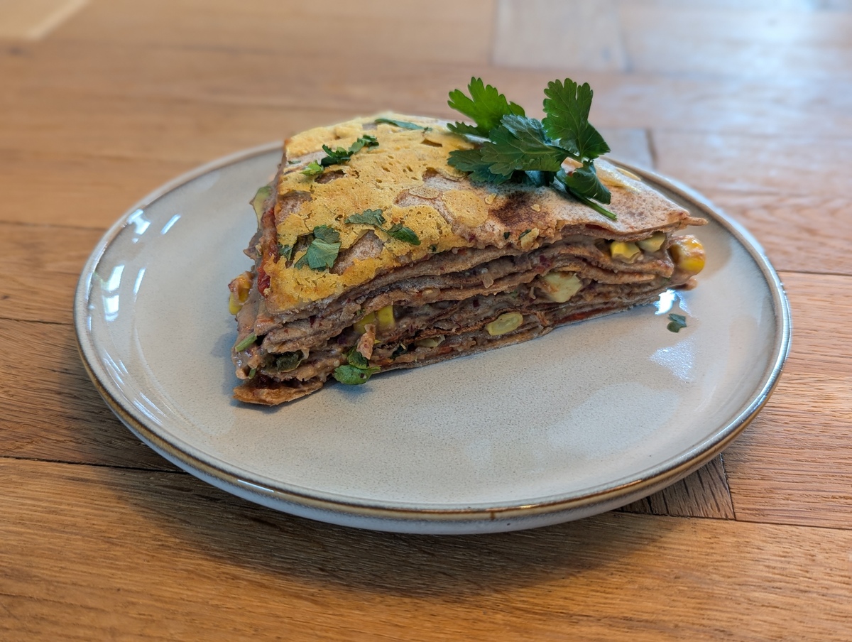 Even rekenen voordat we doorgaan… Zaten er 8 wraps in de verpakking, dan maak je 4 lagen. Gebruik dan 1/3 van de puree/mais/koriander, en 1/4 van de salsasaus per laag. Een pak gekocht met maar 6 wraps? Dan 3 lagen, dus kan de helft van de puree tussen de lagen.