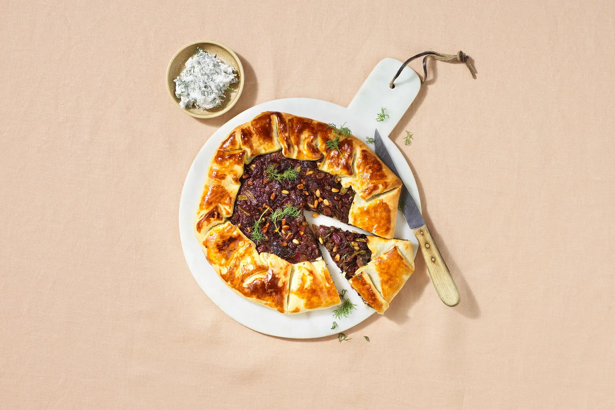 Snijd de galette en serveer met een schepje van de roomkaasdip.