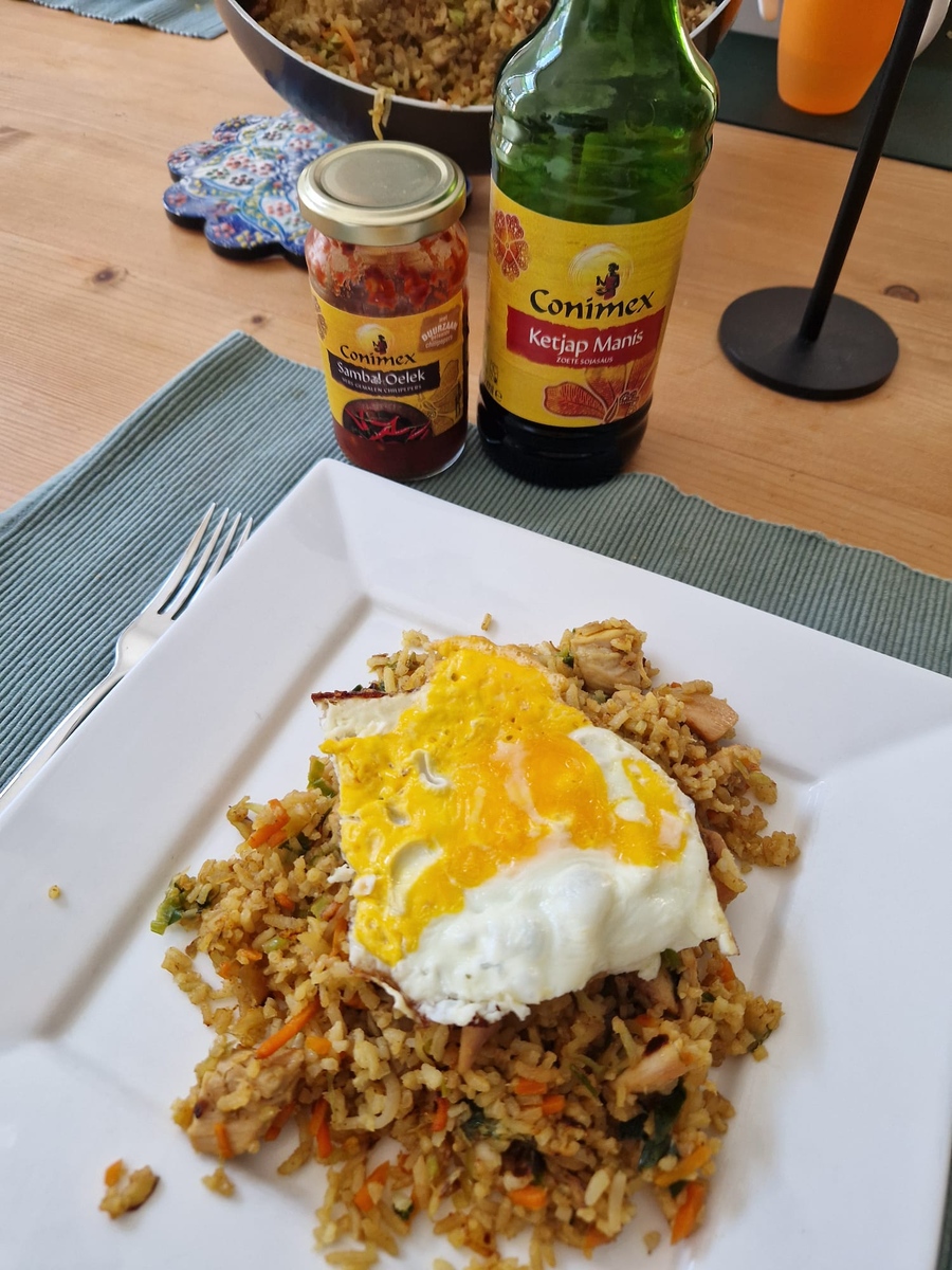 Verdeel de nasi over borden, leg het ei erop en eet smakelijk!