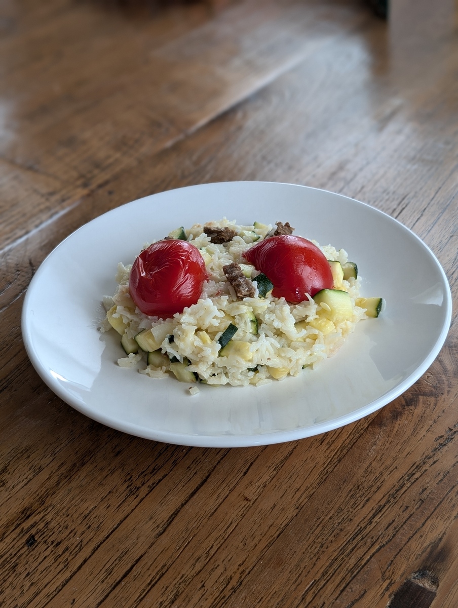 Halveer de tomaten en lepel het vocht eruit. Bestrooi vervolgens met wat peper en zout. Vervolgens duw je de tomaten met de bollen kant naar boven in het rijstmengsel. De bovenkant moet ongeveer gelijk zijn aan de rijst