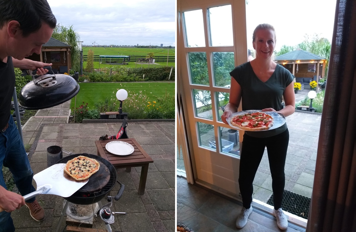 Strooi wat bloem over de pizzasteen en schep voorzichtig jullie creatie er op. Als de barbecue goed warm is (250+ graden) bak je de pizza ongeveer een minuut of 7. Uiteraard kan het ook in de over, dan zou ongeveer 8-10 minuten op 220 graden goed moeten zijn.