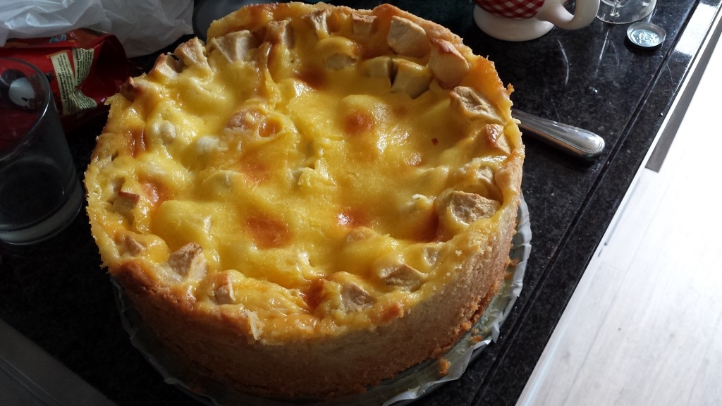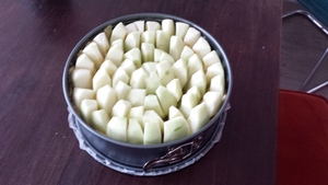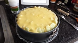 Schep de pudding over de appels in de taartvorm. Probeer een centimeter onder de rand van de vorm te blijven anders kookt het over.